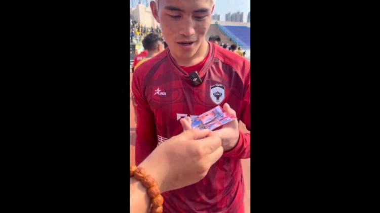 4月1日讯 4月1日,2026泰山好水CMG群众足球邀请赛小组最后一个比赛日,山东泰安队2-2战平青海玉树队,记者牛志明赛后向玉树队门将索南龙周赠送王大雷签名照。被问及看王大雷比赛多不多时,索南龙周说道:“多,这个是我们国家的骄傲,他太帅了。”被问及扑出点球是不是有向王大雷学习的地方时,索...
